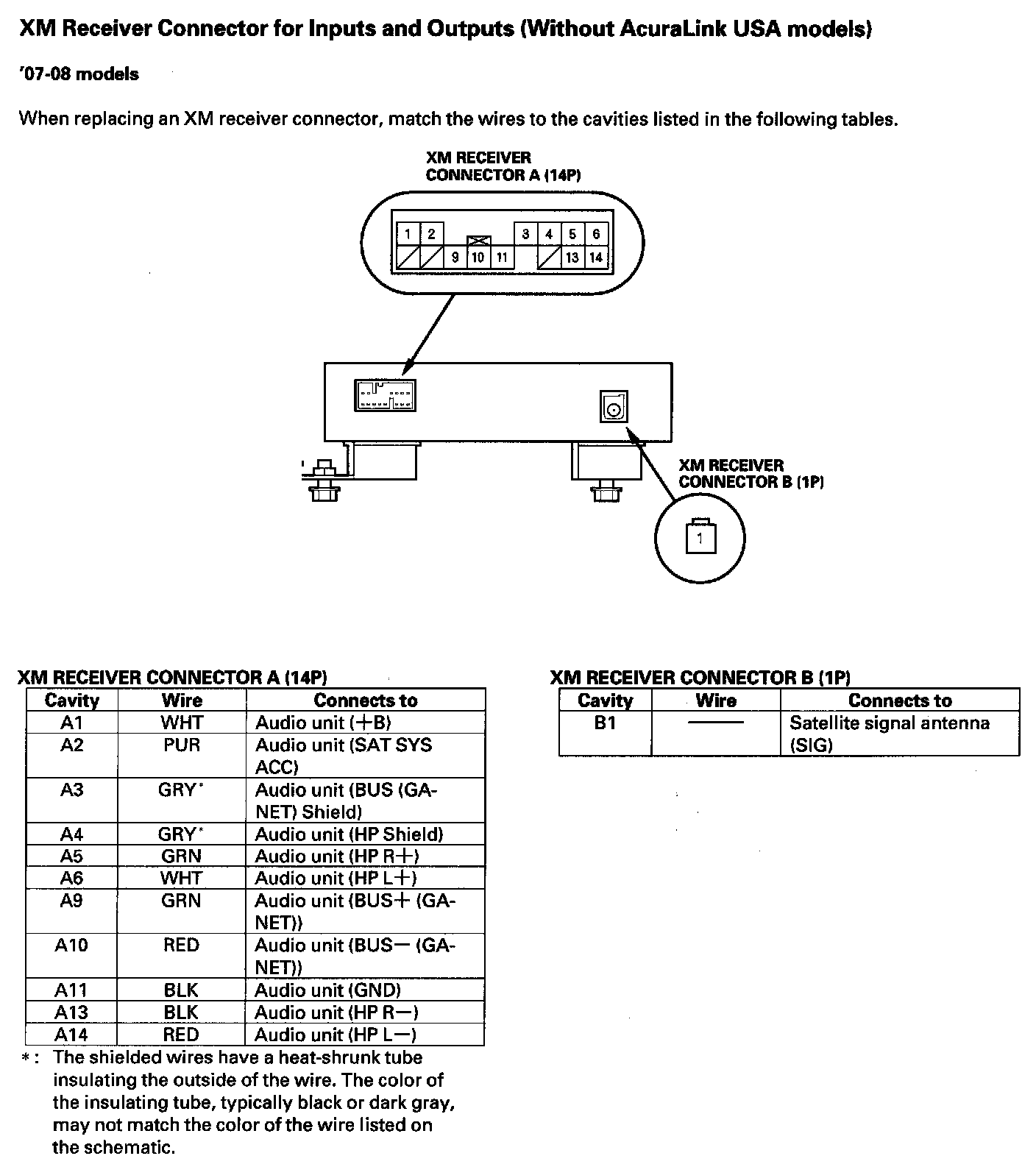 XM Receiver Connector For Inputs And Outputs (Without AcuraLink USA Models):