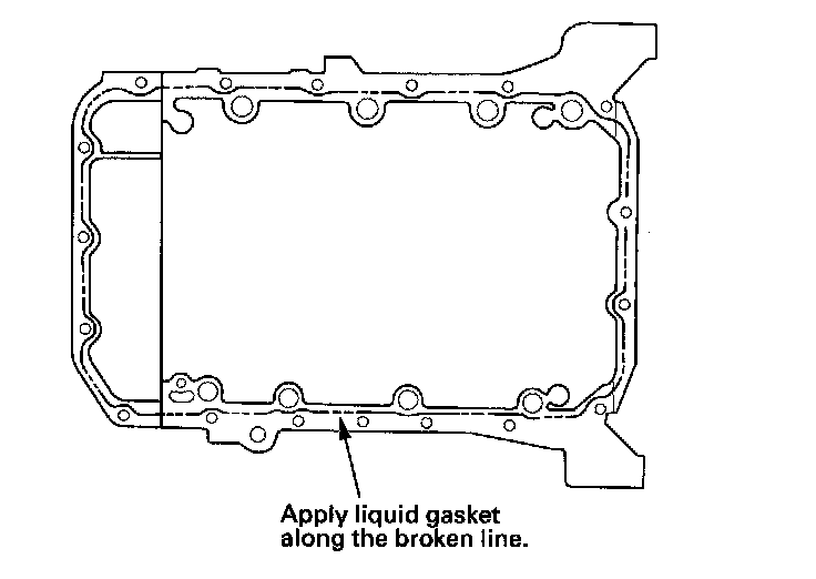 3. Apply liquid gasket, P/N 08717-0004, 08718-0001, 08718-0003, or 08718-009, evenly to the oil pan mating surface of the engine block. Install the component within 5 minutes of applying the liquid gasket.