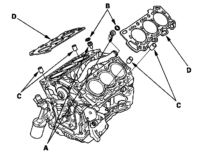 3. Install the dowel pins (C) and new cylinder head gaskets (D).