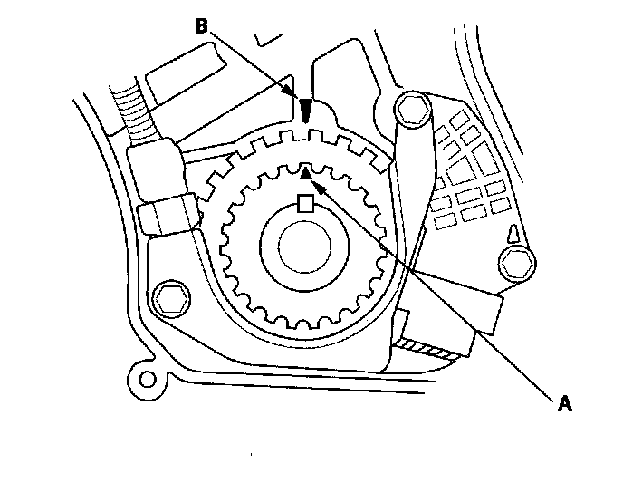 5. Set the timing belt drive pulley to top dead center (TDC) by aligning the TDC mark (A) on the tooth of the timing belt drive pulley with the pointer (B) on the oil pump.