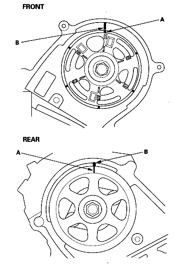 6. Set the camshaft pulleys to TDC by aligning the TDC marks (A) on the camshaft pulleys with the pointers (B) on the back covers.