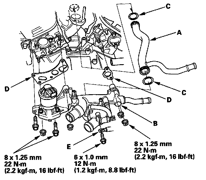 16. Install the connecting pipe (A) and water passage (B), using the O-rings (C) and new gaskets (D).