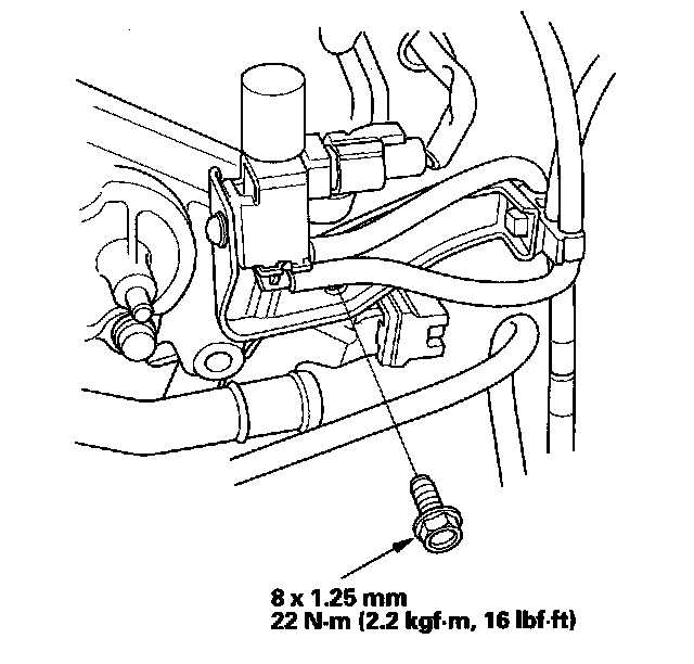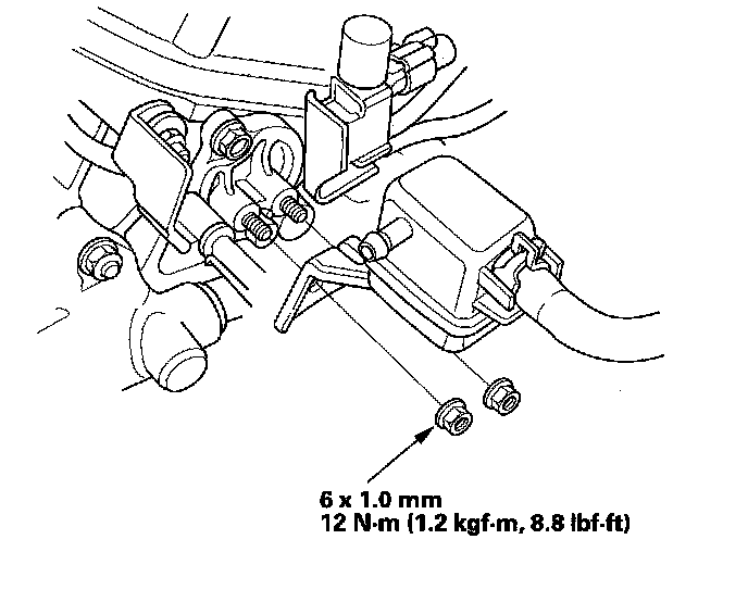 23. Install the two bolts (B) securing the vacuum line.