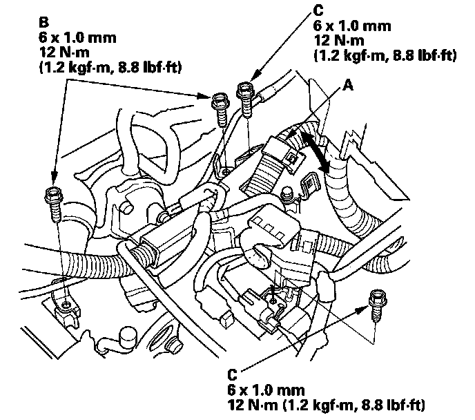 24. Install the two bolts (C) securing harness holder.