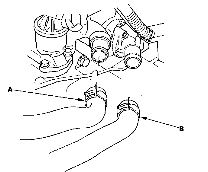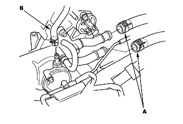 25. Install the heater hoses (A) and water bypass hose (B).