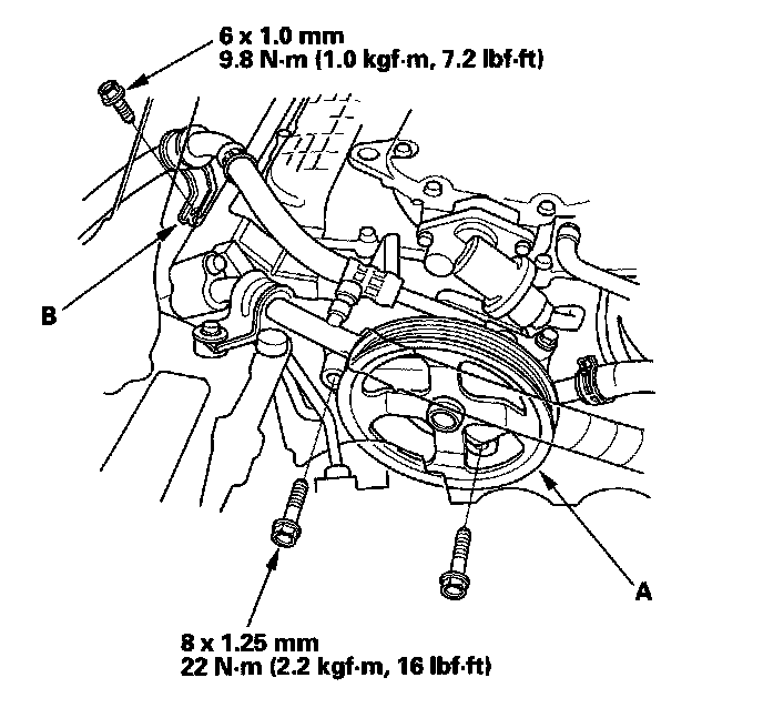 29. Install the power steering (P/S) pump (A) and P/S hose bracket (B).