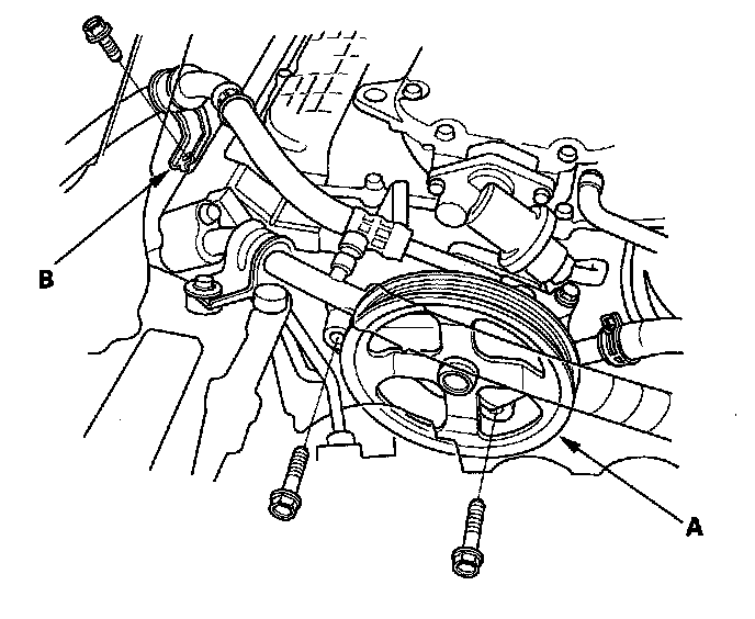 8. Remove the power steering (P/S) pump (A), and P/S hose clamp (B).