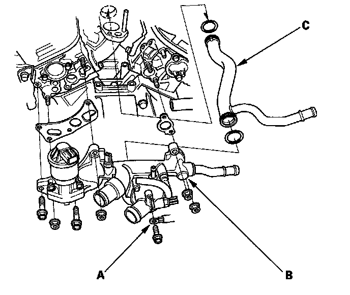 17. Disconnect the heater hoses (A) and water bypass hose (B).