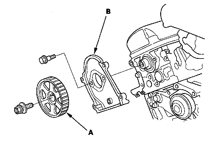 25. Remove the front and rear camshaft pulleys (A) and front and rear back covers (B).