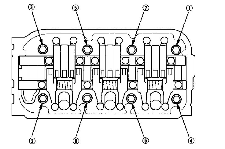 27. Remove the cylinder head bolts. To prevent warpage, loosen the bolts in sequence 1/3 turn at a time; repeat the sequence until all bolts are loosened.