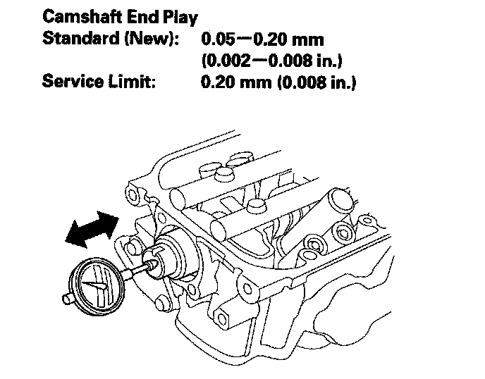 5. Zero the dial indicator against the end of the camshaft. Push the camshaft back and forth and read the end play. If the end play is beyond the service limit, replace the thrust cover and recheck. If it is still beyond the service limit, replace the camshaft.