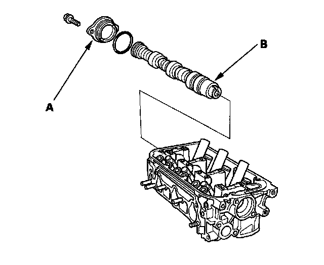 6. Remove the camshaft thrust cover (A), then pull out the camshaft (B).