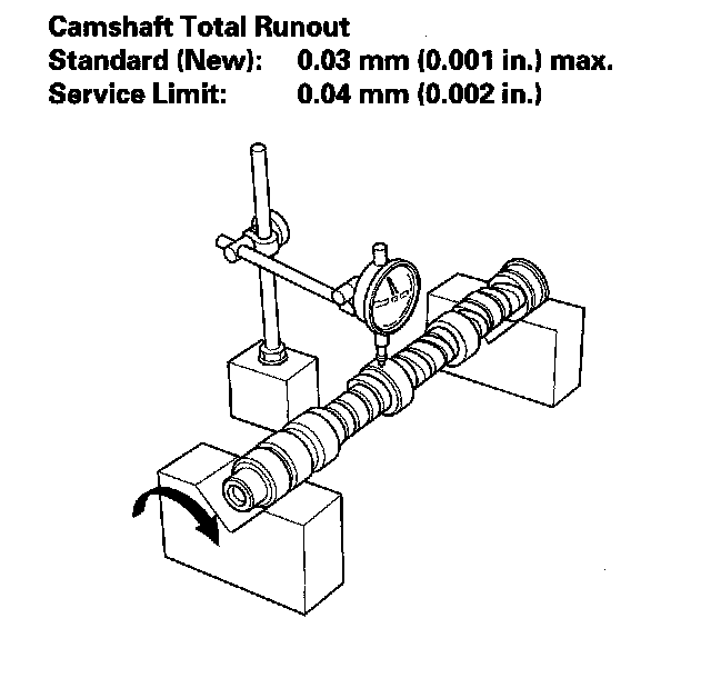 ^ If the total runout is beyond the service limit, replace the camshaft and recheck the oil clearance. If the oil clearance is still out of tolerance, replace the cylinder head.