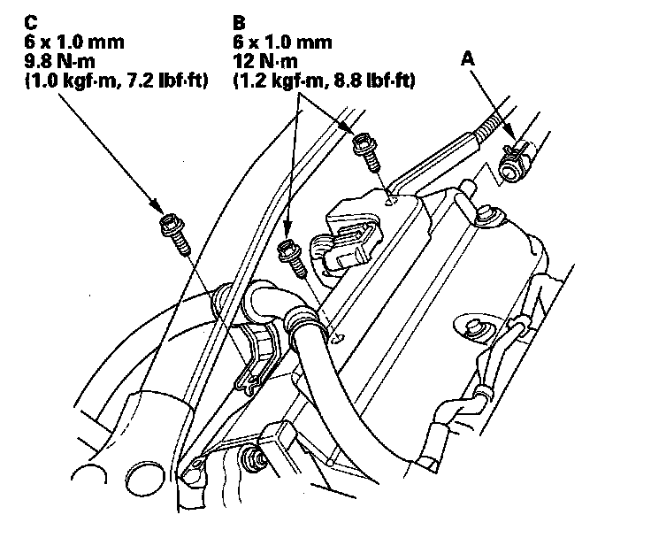 9. Tighten the bolt (C) securing the power steering hose bracket.