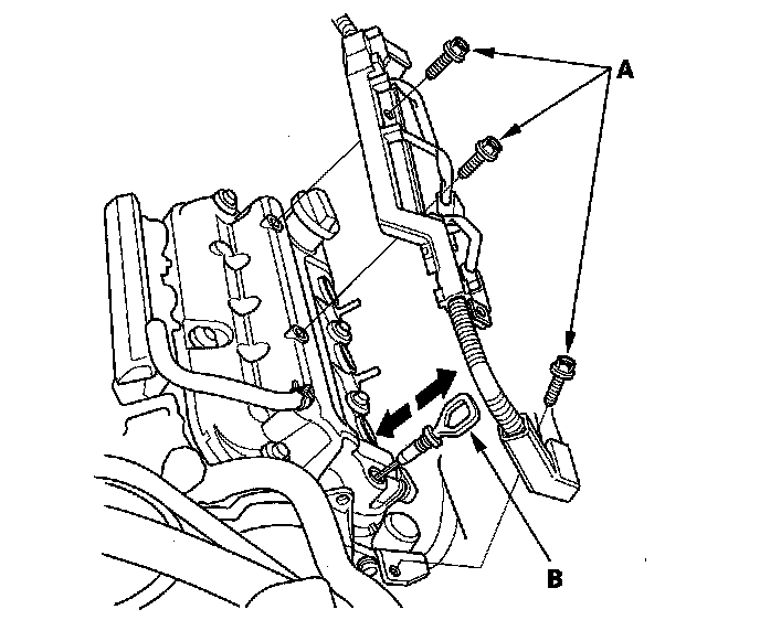 3. Remove the three bolts (A) securing the harness holder, and remove the dipstick (B).