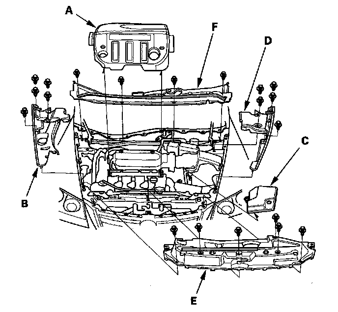 4. Remove the upper grille cover (E) and cowl cover (F).