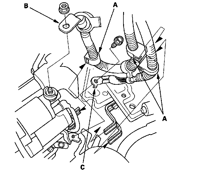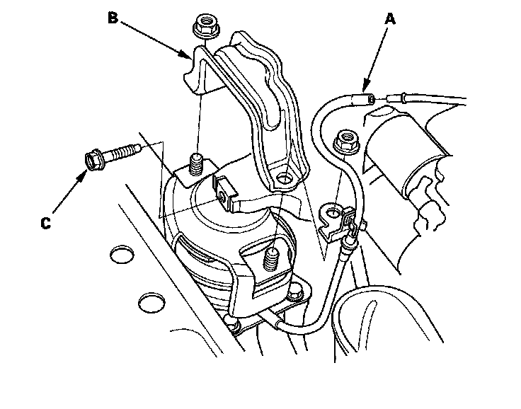 12. Remove the harness clamps (A), starter cable (B), and ground cable (C).