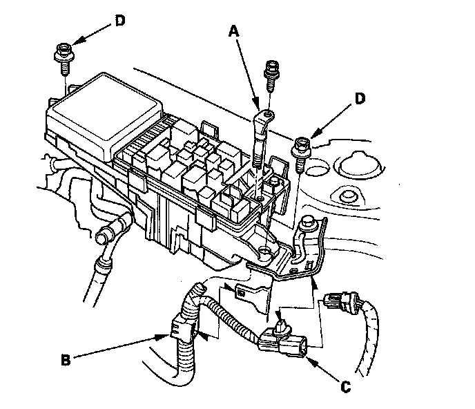 16. Remove the two bolts (D) securing the under-hood fuse/relay box, then remove the under-hood fuse/relay box.