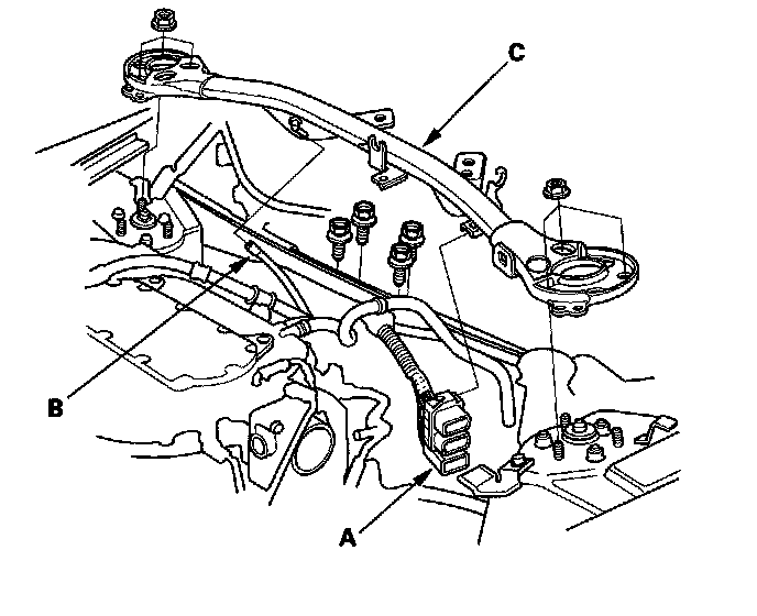 58. Disconnect the vacuum hose (A), then remove the front mount stop (B) and the front mount bolt (C).