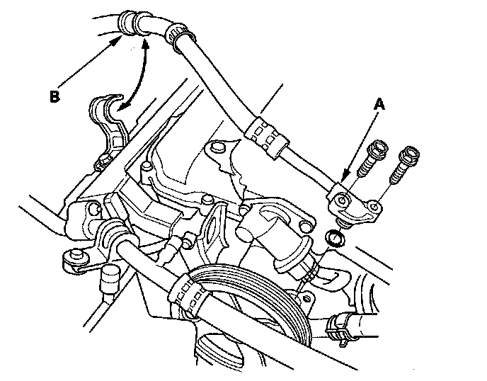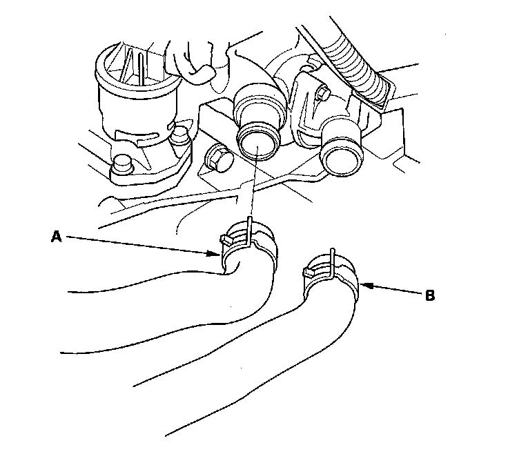 51. Disconnect the upper radiator hose (A) and lower radiator hose (B).