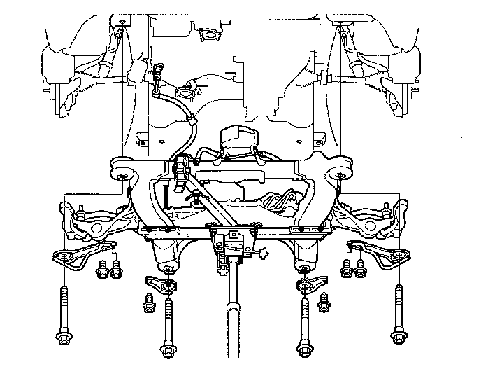 63. Raise the jack and line up the slots in the special tool arms with the bolt holes on the jack base, then securely attach them with four bolts.