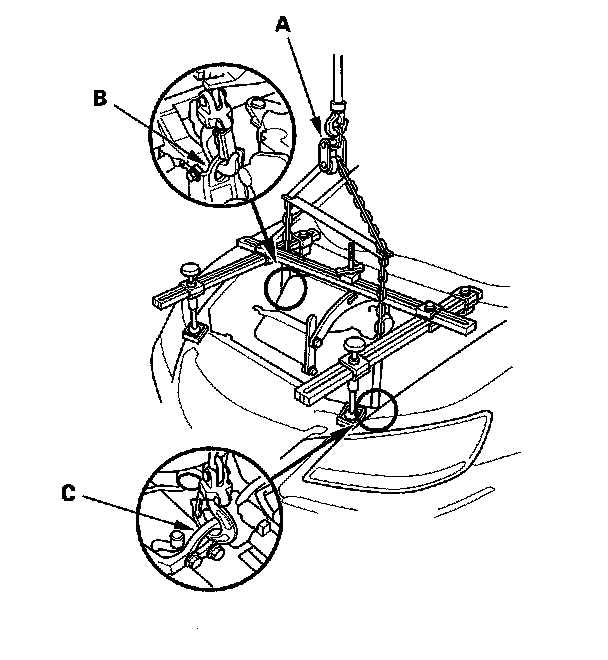 65. Lower the vehicle and attach a chain hoist (A) to the engine hook (B) and transmission hook (C). Lift up on the engine/transmission assembly until it's securely supported by the chain hoist, and remove the engine support hanger and the engine balance bar from the engine and vehicle.