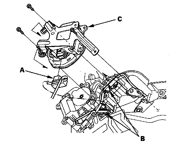 3. Disconnect the 5P connector (A) from the mode control motor. Remove the harness clips (B). Remove the self-tapping screws and the mode control motor (C).