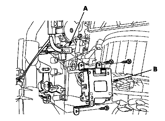 3. Disconnect the 5P connector (A) from the passenger's air mix control motor. Remove the self-tapping screws and the passenger's air mix control motor (B) from the heater unit.