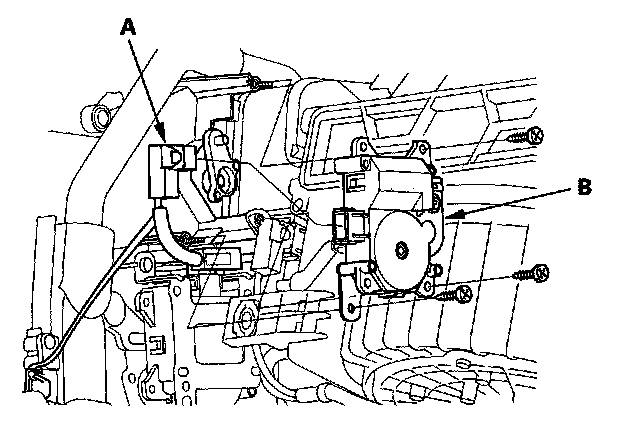 3. Disconnect the 5P connector (A) from the passenger's cool vent control motor. Remove the self-tapping screws and the passenger's cool vent control motor (B) from the heater unit.