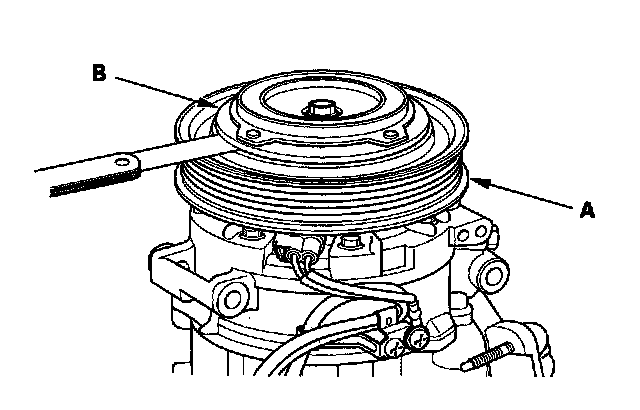 3. Measure the clearance between the pulley (A) and the pressure plate (B) all the way around. If the clearance is not within specified limits, remove the pressure plate and add or remove shims as needed to increase or decrease clearance.