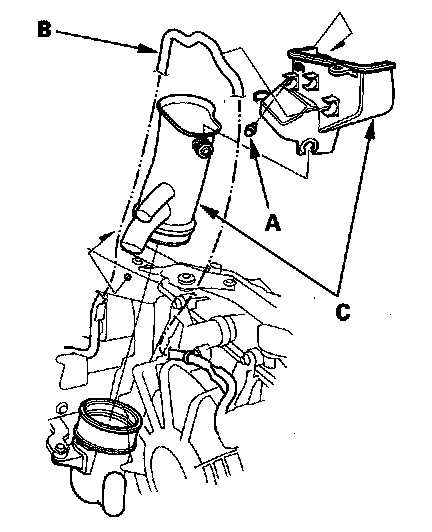 5. Remove the clip (A) and the harness (B), then remove the air intake ducts (C).
