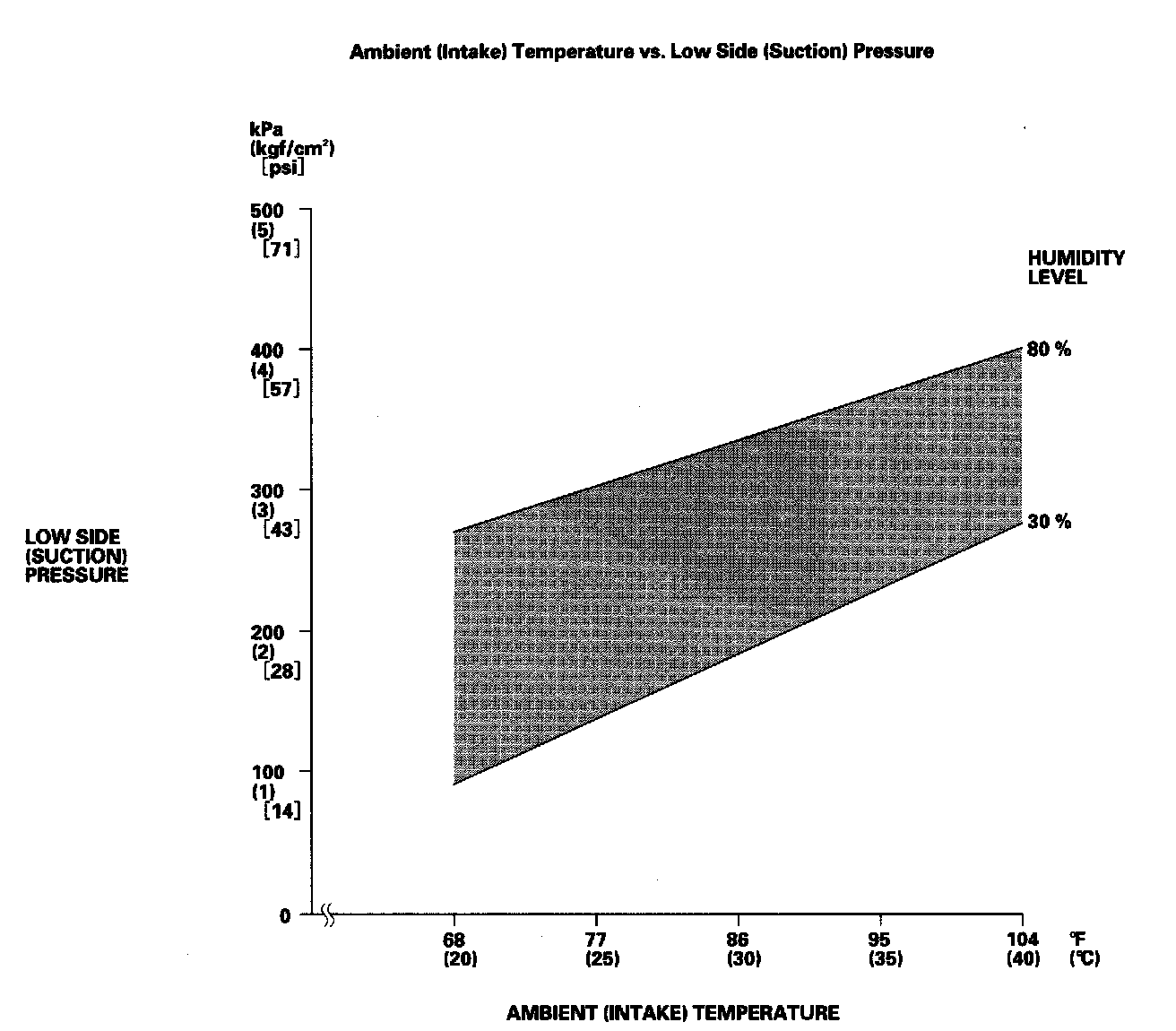 7. After running the air conditioning for 10 minutes under the above test conditions, read the delivery temperature from the thermometer in the center vent, the intake temperature near the blower unit, and the discharge (high) and suction (low) pressures on the A/C gauges.