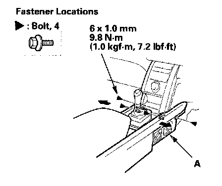 2. Remove the bolts securing the front of the center console (A), then pull out both sides as needed.