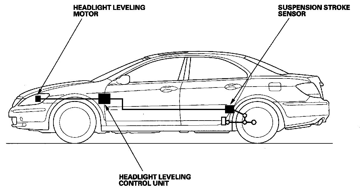 The headlight leveling system is composed of the headlight leveling control unit, the suspension stroke sensor, and the left and right headlight leveling motors.