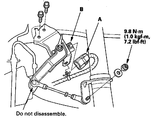 2. Disconnect the 3P connector (A) from the suspension stroke sensor (B).