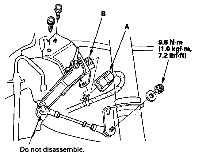 2. Disconnect the 3P connector (A) from the suspension stroke sensor (B).