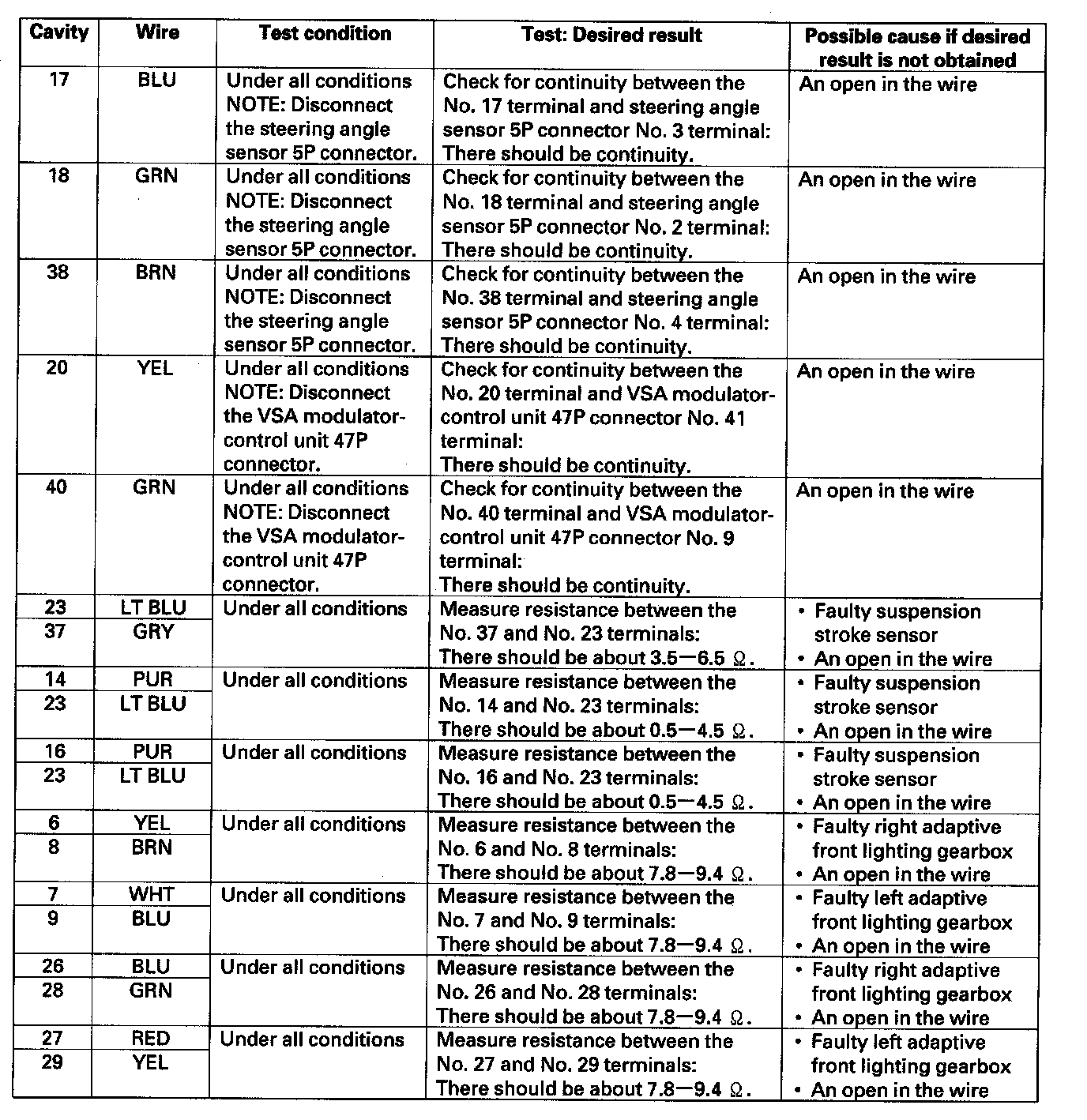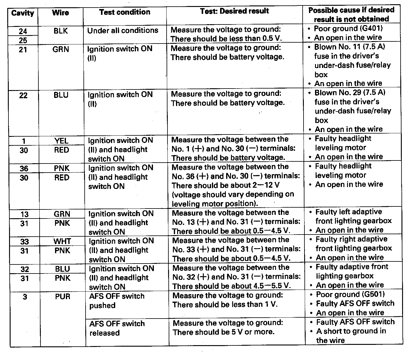 5. Reconnect the 40P connector to the adaptive front lighting control unit, and make these input tests at the connector.