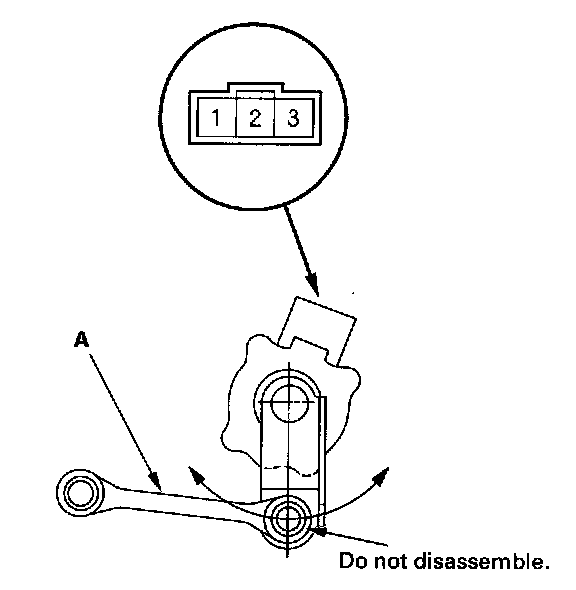 3. Measure the resistance between suspension stroke sensor 3P connector terminals No. 2 and No. 3 with the linkage (A) moved. There should be about 0.5-4.5 kohms.