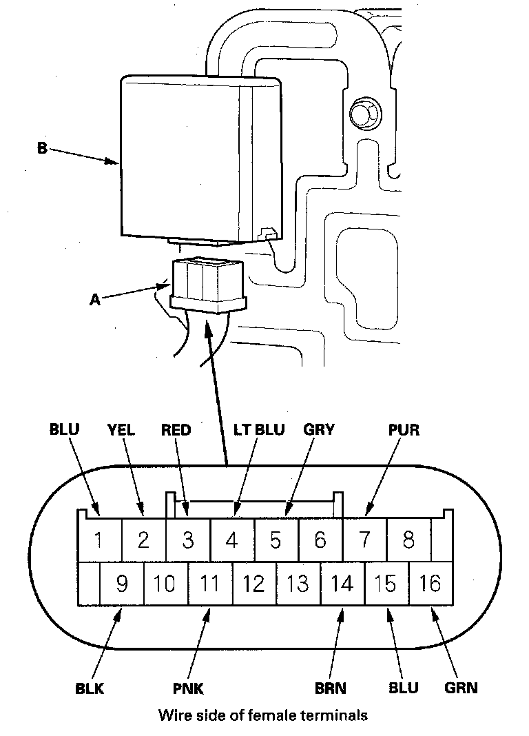 2. Disconnect the 16P connector (A) from the headlight leveling control unit (B).