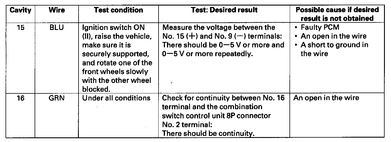 5. Reconnect the connector to the control unit, and make these input tests at the connector.