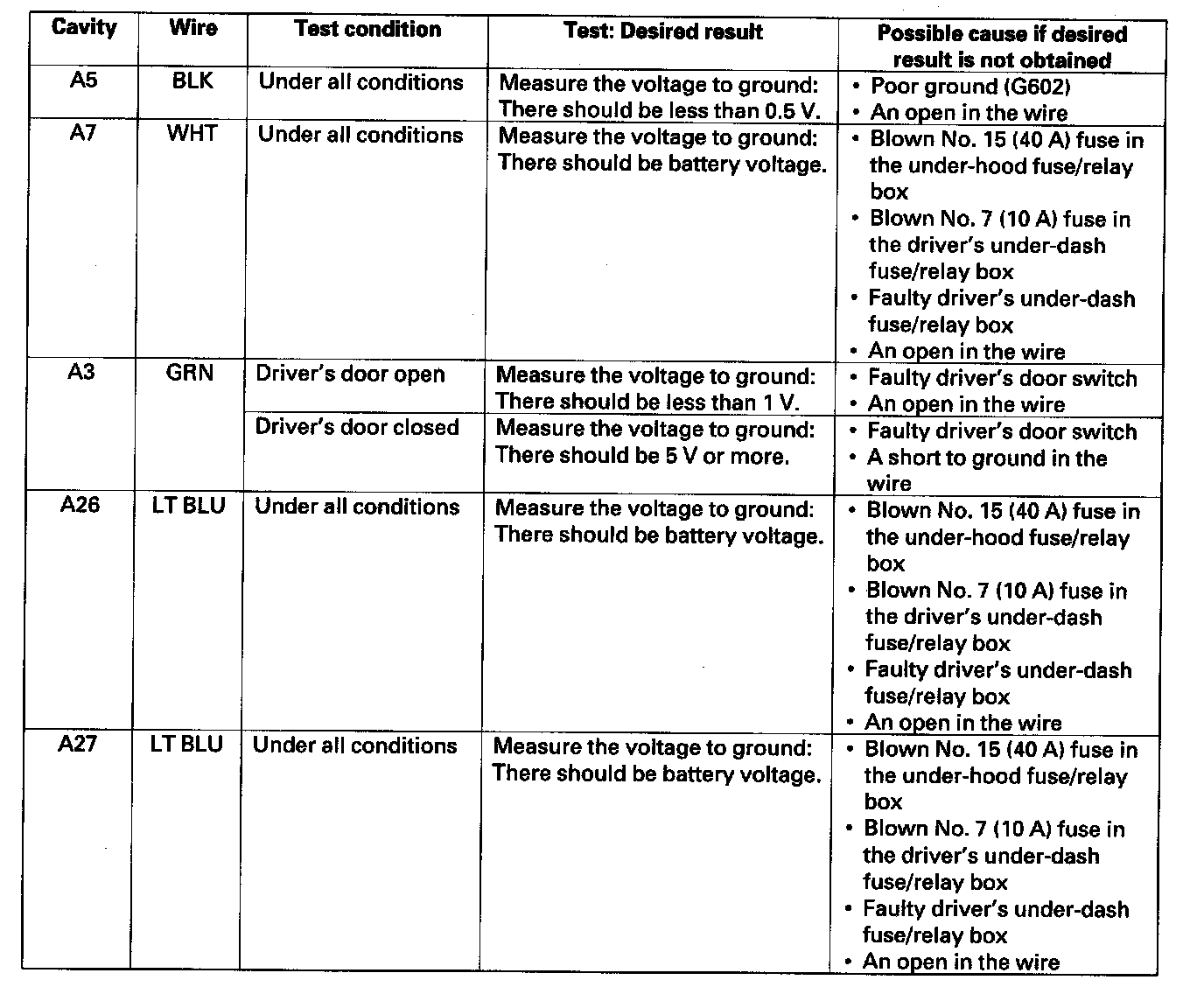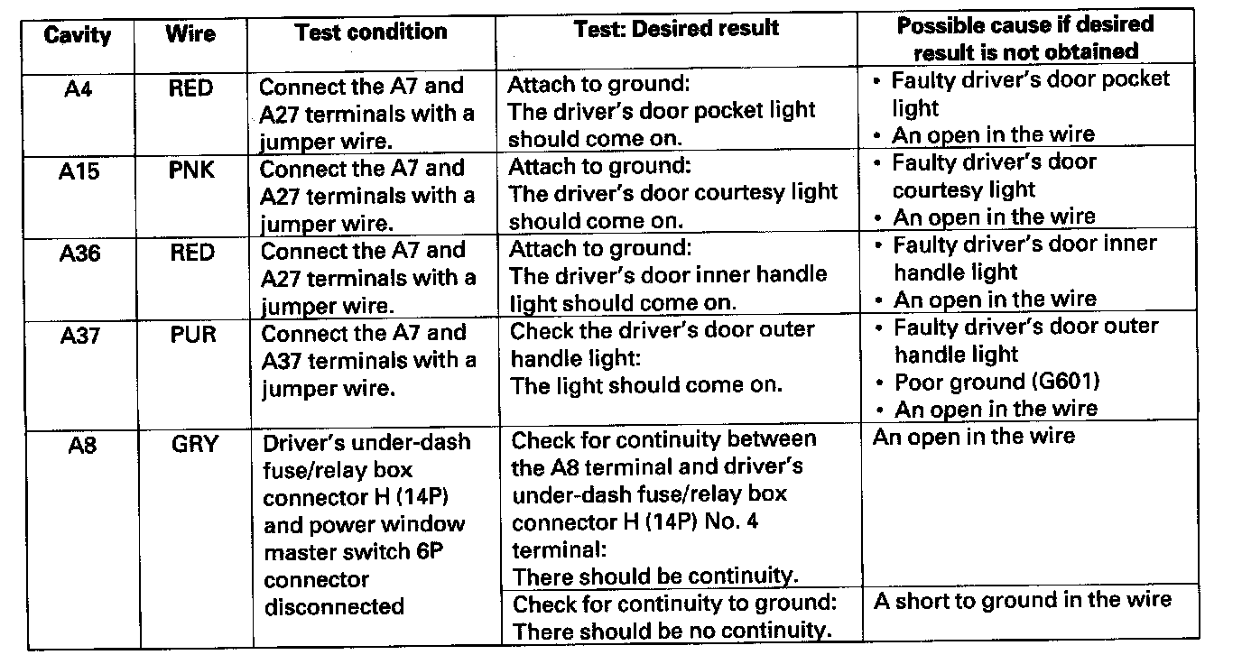 6. Reconnect the connector to the driver's MPCS unit, and make these input tests at the connector.