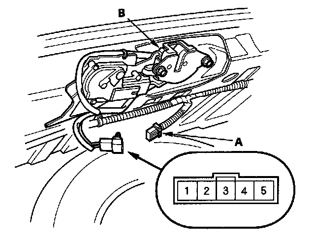 2. Disconnect the 5P connector (A) from the trunk lid latch (B).