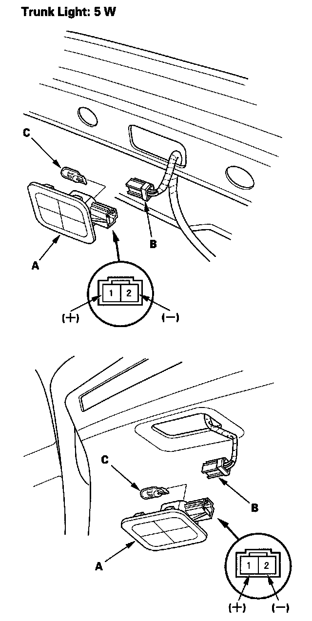 4. Check for continuity between the No. 1 (+) and No. 2 (-) terminals. There should be continuity. If there is no continuity, check the bulb (C). If the bulb is OK, replace the trunk light.