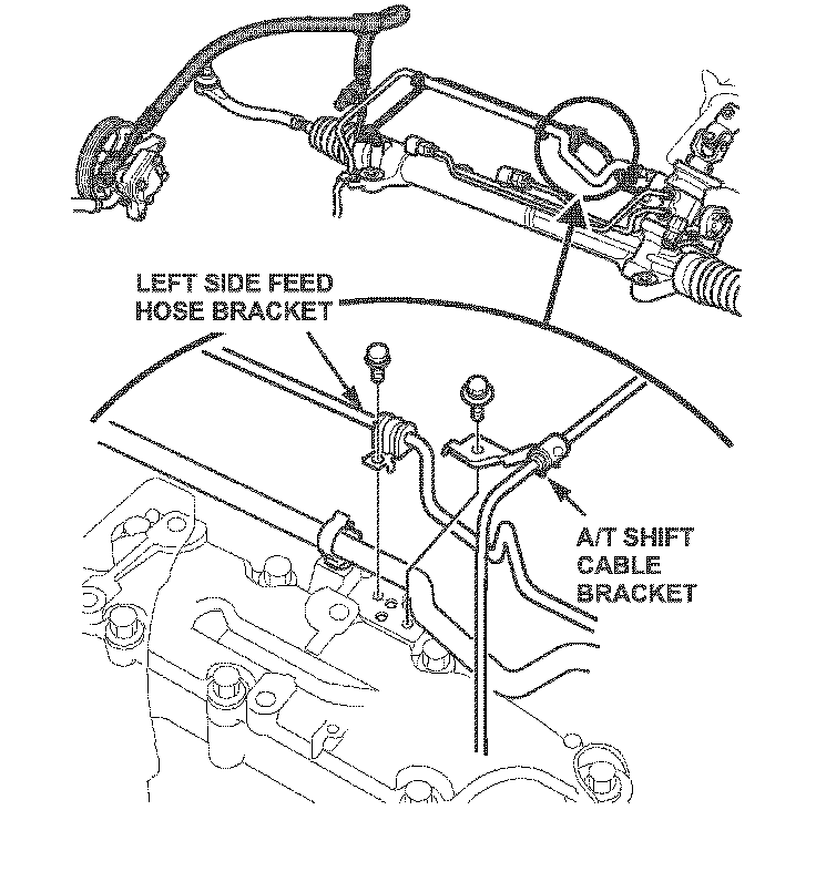 ^ Torque the feed hose bracket bolts and the A/T shift cable bracket bolt to 9.8 N.m (7.2 lb-ft).