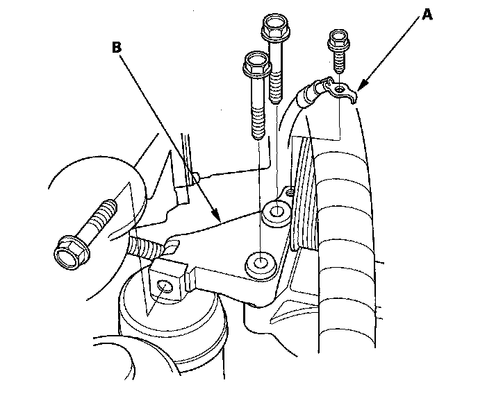 9. Remove the ground cable (A), then remove the upper bracket (B).
