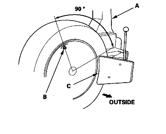 - Position the wheel as shown so the valve stem (B) is 90 degrees from the bead breaker (C) as shown.