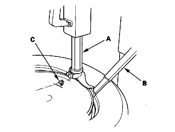 5. Position the wheel so the tire machine (A) and tire iron (B) are next to the valve stem (C) and will move away from it when the machine starts. Then remove the tire from the wheel.