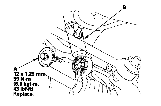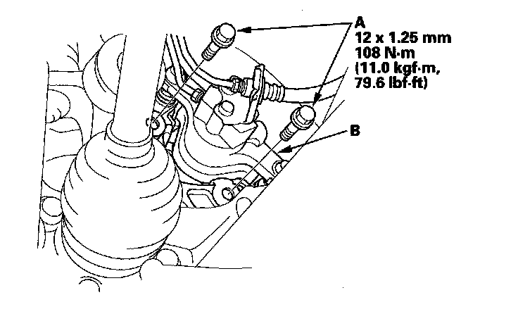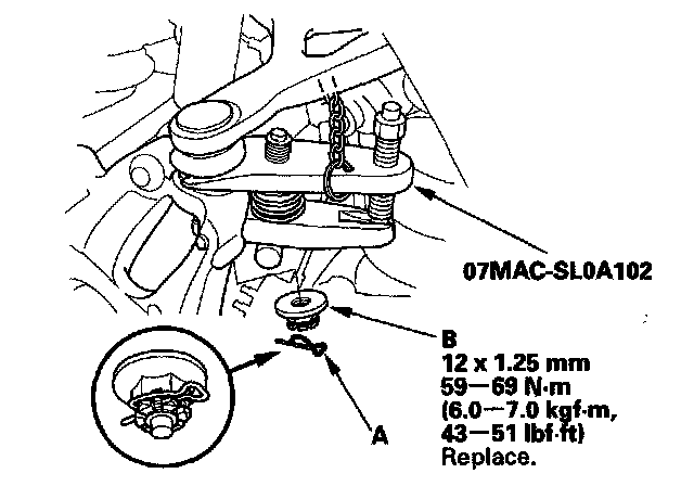 9. Remove the damper lower mounting bolt (A), and disconnect the damper (B) from the knuckle.