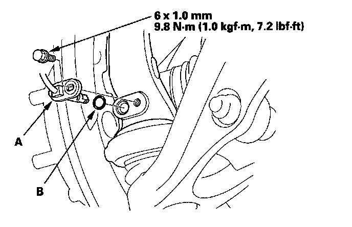 5. Remove the wheel sensor (A) and O-ring (B) from the knuckle. Do not disconnect the wheel sensor connector.
