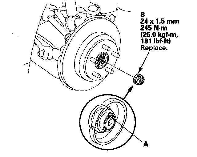 ^ Before installing the spindle nut, apply a small amount of engine oil to the seating surface of the nut. After tightening, use a drift to stake the spindle nut shoulder against the driveshaft.